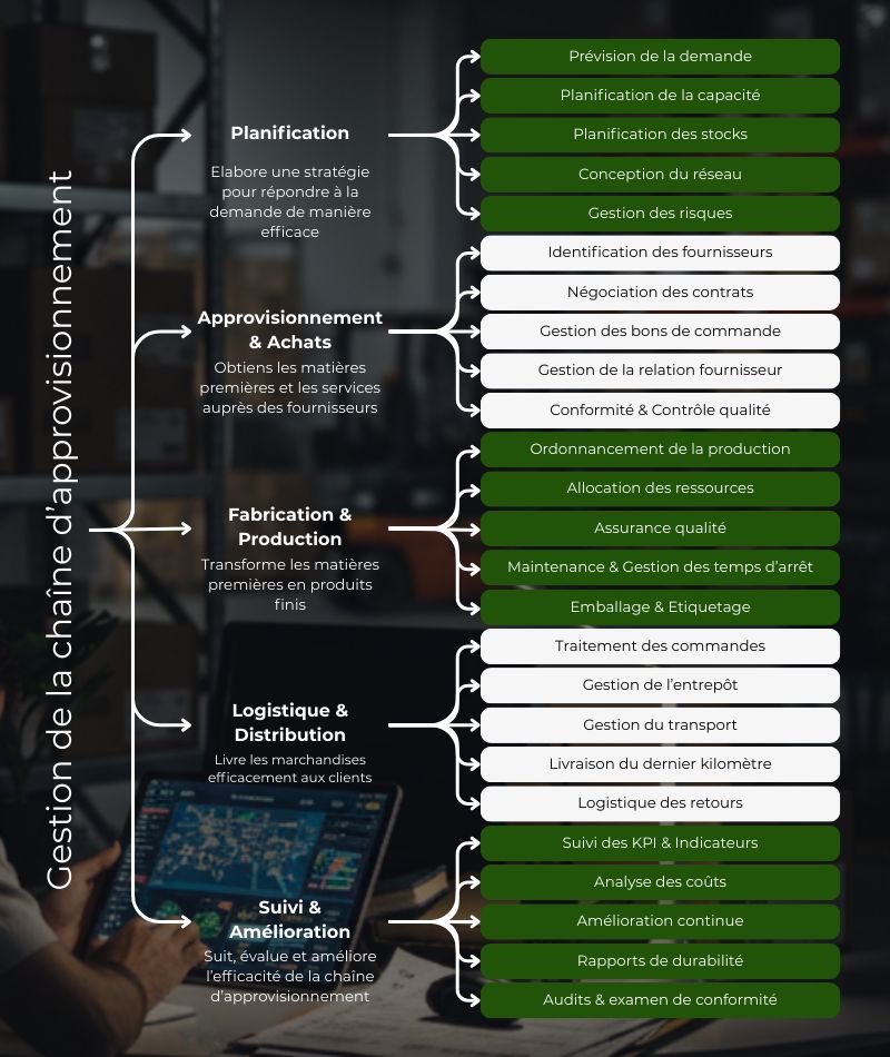 Ce visuel décompose l’ensemble du workflow de Supply Chain Management, de la planification jusqu’à l’amélioration continue.